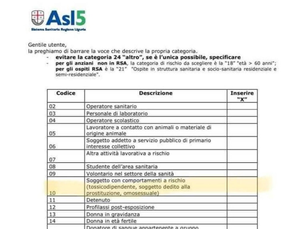 Questo documento dell’ASL ligure relativo al vaccino anti Covid-19, presenta quello che verrà in seguito definito dai responsabili un errore di disattenzione, ma a mio avviso, nasconde molto di più. Non è solo una palese dimostrazione dell’assenza di sensibilità e cultura da parte della pubblica amministrazione italiana ma, è anche una sorta di monito, di cui non avevamo bisogno, che ci ha ricordato qual è il nostro posto nel mondo, secondo chi comanda.